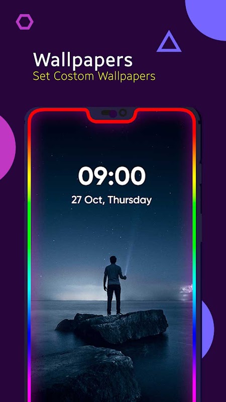 Wallpaper borders place light around all screen with a variety of 🌤edge lighting wallpaper clips.Show lighting effects around the lock screen. You can adjust brightness on display.