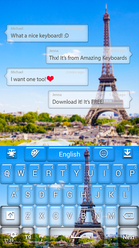 لقد قمنا بتصميم لوحة المفاتيح هذه مع باريس جميلة في الخلفية وبرج ايفل يقف فخورا وطويل القامة على كل ما تبذلونه من مفاتيح.