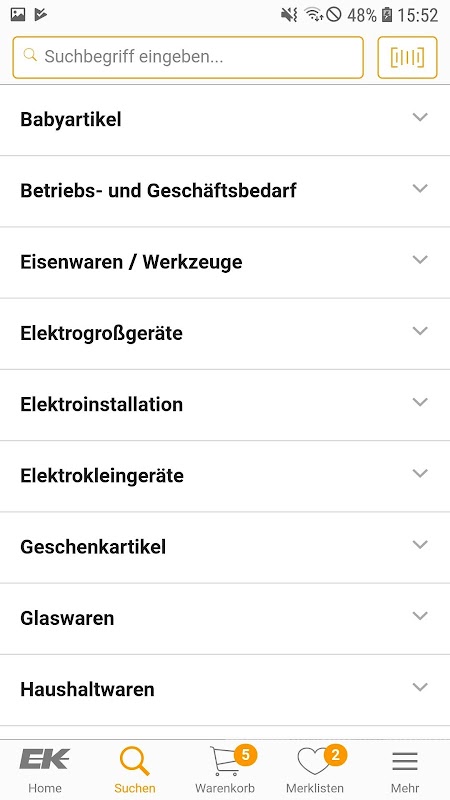 قلب التطبيق EK هو البحث عن نص كامل ذكي. مع اقتراحات البحث في الوقت الفعلي ، واختيار مجموعة المنتجات وخيارات التصفية ، فهي متاحة للشريك التجاري كأداة تسوق متنقلة. بالإضافة إلى معلومات مفصلة عن المادة مع صور بزاوية 360 درجة وميزات المنتج ، يمكن للشركاء التجاريين أيضًا الوصول إلى عروض الخصم الحالية والطلبات الموضوعة. بالإضافة إلى ذلك ، يوفر EK App أقصى شفافية السعر. يرى الموزع دائما أفضل سعر له ، بما في ذلك الخصومات والشروط الخاصة ، فضلا عن تقييم الأثر البيئي أو سعر المبيعات المحسوب بشكل فردي.