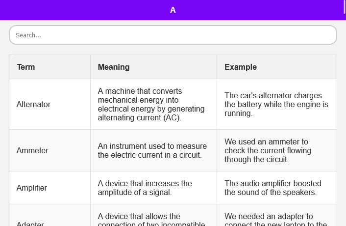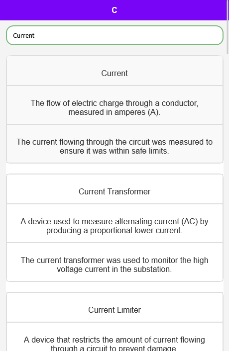 تعريفات واضحة: يوفر كل إدخال في القاموس الكهربائي تعريفًا دقيقًا وسهل الفهم. نحن نهدف إلى تبسيط المفاهيم الكهربائية المعقدة حتى يتمكن أي شخص، بغض النظر عن مستوى خبرته، من فهمها بسهولة.