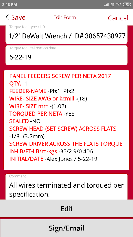 يمكن تحديد إعدادات عزم الدوران وتعبئتها تلقائيًا في المستند. يرضي وثائق التكليف. يمكن التقاط صور مغذيات اللوحات الكهربائية وأسلاك التوزيع والمعدات وختم التاريخ الزمني في مستند الشهادة.
