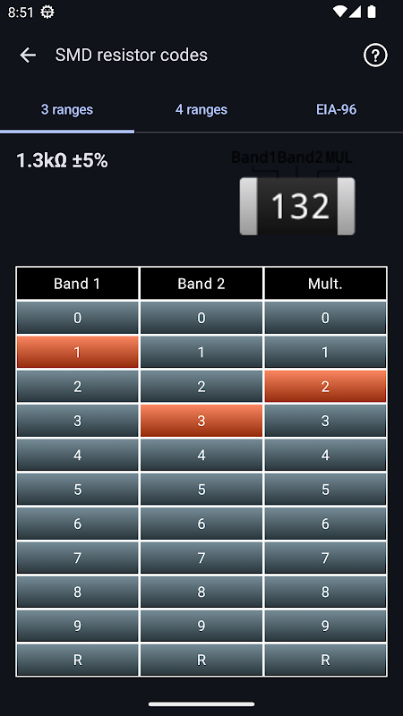 يتضمن التطبيق أيضًا أقسامًا مساعدة وشروحات مفصلة لجميع الرموز المدعومة، بالإضافة إلى جداول قيم سلسلة E القياسية.