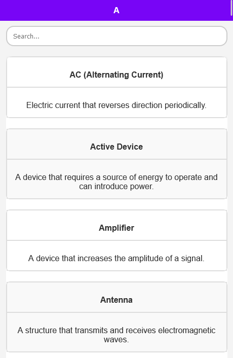 ميزة البحث: تم تصميم تطبيق قاموس الإلكترونيات باستخدام وظيفة بحث قوية. اعثر على ما تبحث عنه بالضبط من خلال ميزة البحث المتقدم لدينا. ما عليك سوى كتابة مصطلح أو كلمة للحصول على نتائج فورية وتفسيرات مفصلة.