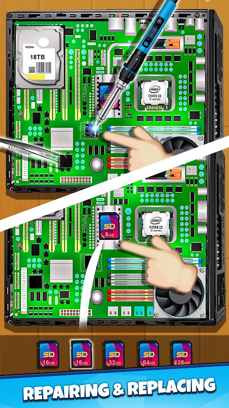 مع تقدمك في لعبة إصلاح الأجهزة الإلكترونية، يمكنك إتقان فن إصلاح أجهزة الكمبيوتر المحمولة وبناء أجهزة الكمبيوتر وإصلاح الأجهزة الإلكترونية، لتصبح خبير إصلاح الأجهزة الإلكترونية في عالم ألعاب إصلاح الكمبيوتر. سيجذب متجر الإصلاح الخاص بك المزيد من العملاء الباحثين عن خدمة الإصلاح، ويجلب كل تحدٍ للإصلاح مهام تجميع كمبيوتر فريدة من نوعها، من إصلاحات أجهزة الكمبيوتر المحمولة الدقيقة إلى إصلاحات الأجهزة الكاملة على إعدادات سطح المكتب المخصصة المختلفة لألعاب إصلاح الأجهزة الإلكترونية. بصفتك مصلحًا محترفًا، اعمل على ترقية أجهزة الكمبيوتر لتناسب مواصفات الألعاب وتطبيق تصميمات الكمبيوتر الإبداعية التي تجعل كل نظام يبرز في ألعاب إصلاحها دون اتصال بالإنترنت.