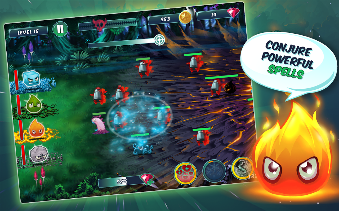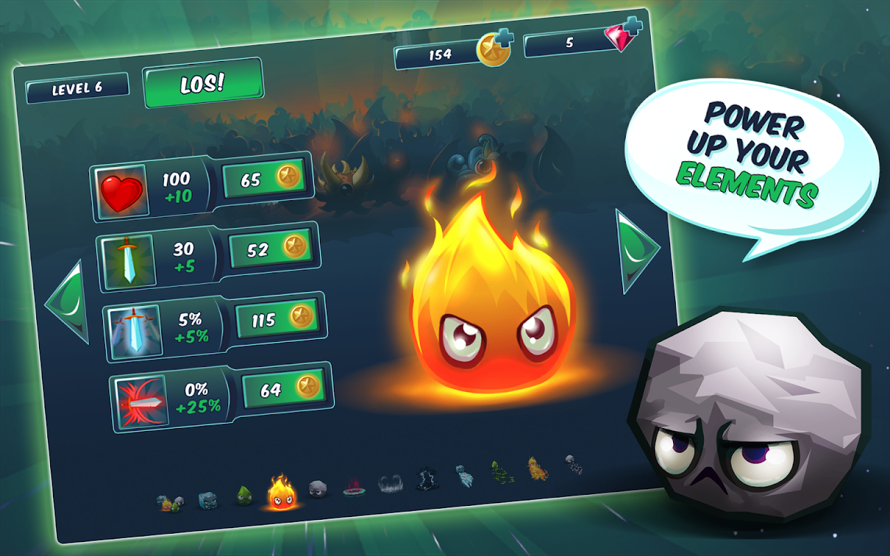 Each level will task you with defeating a certain number of monsters. Make sure that your elements are eaten alive! For every monster you defeat and every level you reach, you will receive rewards in the game. You can also improve your elements' stats and fortify your base.