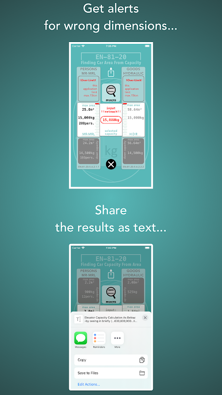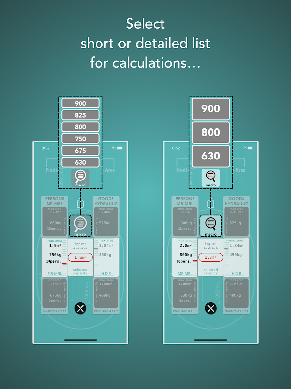 هذا التطبيق يساعد على اختيار حجم المصاعد سيارة والقدرة وفقا لEN 81/20 القياسية.