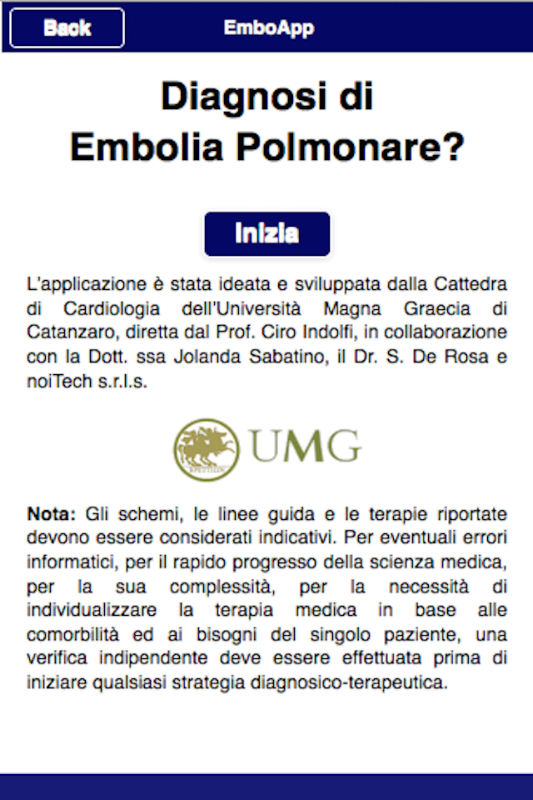 Applicazione creata per semplificare la stratificazione del rischio di mortalità precoce e la scelta del giusto trattamento dell'embolia polmonare acuta nonché della corretta profilassi secondaria.