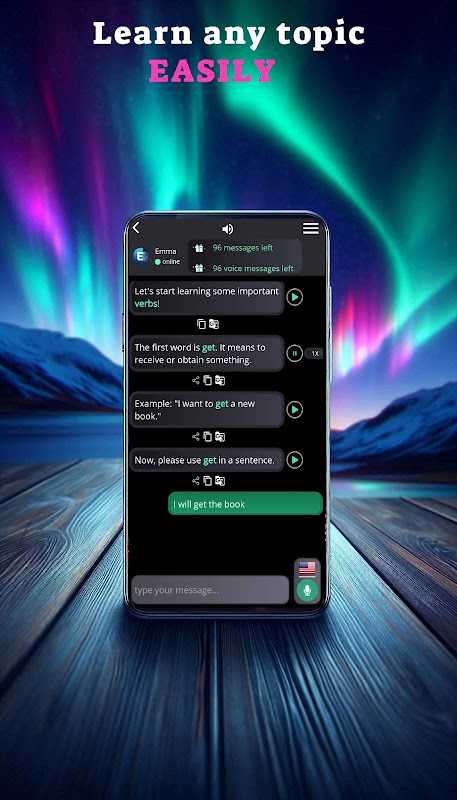 إيما أكثر من مجرد تطبيق - إنها مدرس اللغة الإنجليزية الشخصي الخاص بك. يمكنك الدردشة عبر الرسائل النصية أو الصوتية، وممارسة المحادثات الطبيعية في أي وقت وفي أي مكان. يستجيب الذكاء الاصطناعي في الوقت الفعلي، ويصحح أخطائك، ويحسن نطقك، ويساعدك على بناء الثقة في التحدث باللغة الإنجليزية.