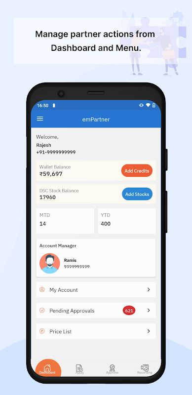 يسهل تطبيق emPartner لشركاء eMudhra تسجيل الدخول على الهاتف المحمول ويمكنهم أداء الأنشطة التالية.
