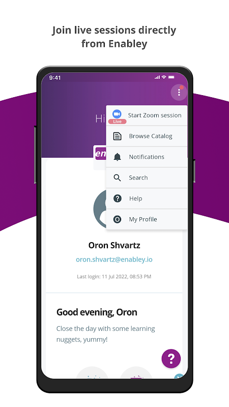 يتيح لك تطبيق التمكين أيضًا الانضمام إلى الجلسات المباشرة مباشرة من داخل دورات التمكين الخاصة بك، مع الاستفادة من تكامل Zoom المدمج.