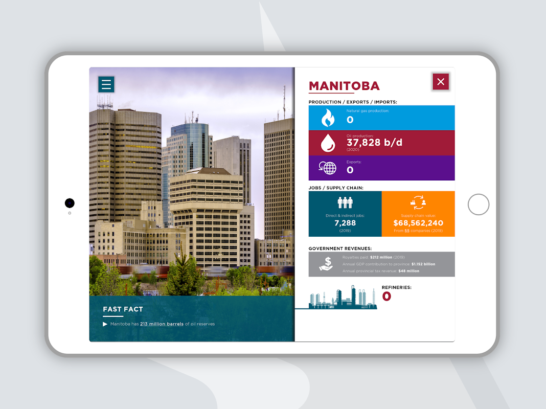 Canada’s oil and natural gas industry is active in 12 of 13 provinces and territories. Using goods and services from many regions, Canada’s exploration and production of oil and natural gas is truly a national industry. Explore the diversity of Canada's oil and natural gas resources across the country in this interactive, informative AR experience. Learn more about this nationwide industry and its regional and national benefits with an interactive map, populated by beautiful infographics.