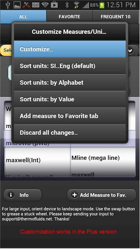 8 مستويات مختلفة من التخصيص: مقياس يمكن إضافتها أو حذفها من علامة التبويب المفضلة. وبمجرد الإعلان عن تدبير المفضلة، وحدات يمكن فرزها أبجديا أو حسب القيمة من خلال اختيار الأمر فرز من القائمة تخصيص. يمكن حذف وحدات غير المرغوب فيها ببساطة عن طريق مواءمة عجلات للوحدة غير مرغوب فيها والنقر على زر حذف. يمكن إضافة وحدة جديدة أو حتى تدابير جديدة.