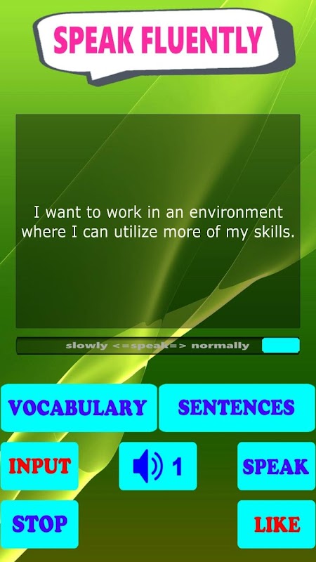 ميزة التحدث بطلاقة سوف تسمح لك ممارسة التحدث مع أي المفردات (النطق) والجمل التي تريدها. فقط اكتب أو الصق المفردات الخاصة بك أو الجمل، والسماح للالتطبيق يساعدك التحدث بها بشكل صحيح.