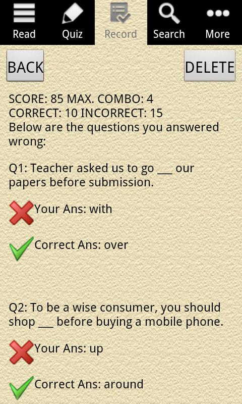 ★ يفصل نتيجة الاختبار: وهو يبين الأسئلة التي أجبت بشكل غير صحيح، والنتيجة، كحد أقصى. السرد (كحد أقصى أجاب عدد من الأسئلة بشكل صحيح على التوالي)، وتاريخ ووقت الاختبار. والأفضل من ذلك، فإنه يدل على أسئلتك خطأ متكررة جدا! ومن المفيد للمراجعة ومثيرة للاهتمام لتحدي مع أصدقائك!