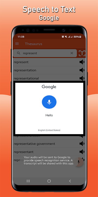 أدخل كلمة في مربع البحث من خلال الكلام الصوتي ، واستخدم البحث الصوتي للعثور على تعريفات قاموس المرادفات دون كتابة كلمة واحدة. سيعرض تحويل النص إلى كلام نتائج صوت الكلام ، ثم حدد الكلمة المطلوبة للبحث عن المعنى ونوع القواعد النحوية والتعريف والمرادف والمتضادات.