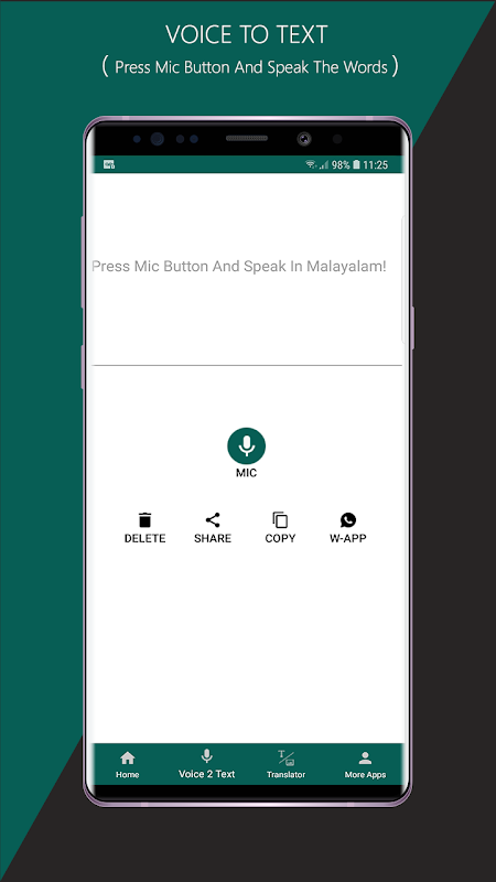 Easy way to Translate your voice / speech to text and image to text into Malayalam Language and translate English to Malayalam using English to Malayalam Voice + Image Text Translator with a click of a button.Forget about installing additional Malayalam keyboard to type words or to translate English to Malayalam To chat on WhatsApp,Facebook or an email.Press the mic button to speak and this app will translate your speech to the text.Pick an image from gallery or using camera or any gallery apps or photo apps and convert to Malayalam instantly.Also use Text translator to translate English to Malayalam or Vice Versa.
