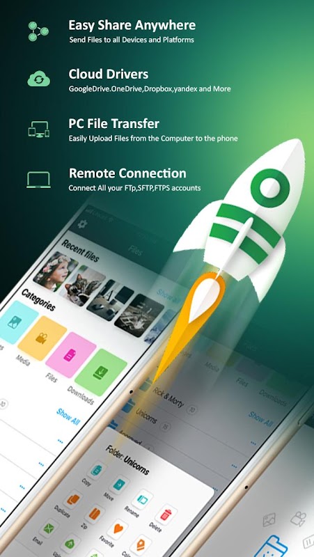 يدعم هذا التطبيق كل إجراءات إدارة الملفات (فتح ، بحث ، تصفح الدليل ، قص / نسخ / لصق ، حذف ، إعادة تسمية ، ضغط ، فك ضغط ، نقل ، تنزيل ، إشارة مرجعية ، وتنظيم).
