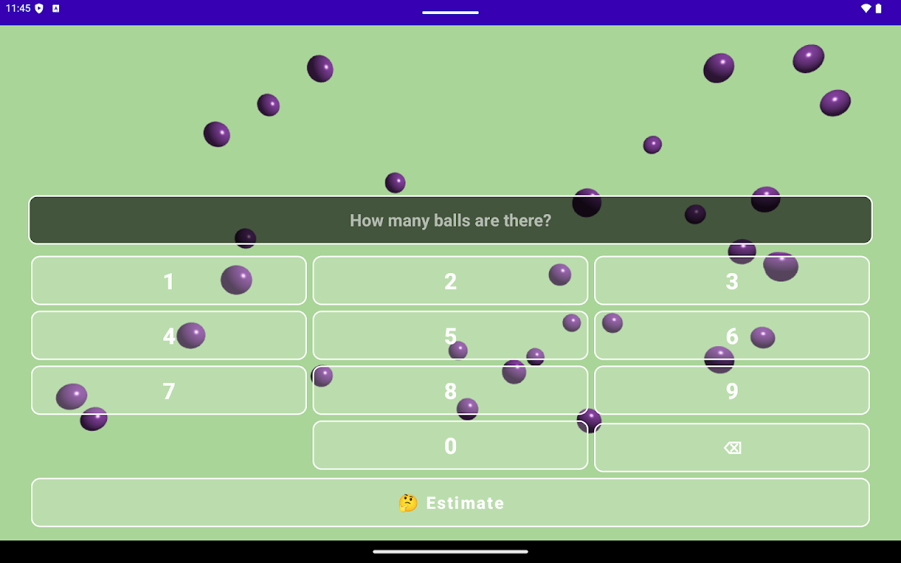 Estiball لعبة تقدير شيّقة تختبر قدرتك على تحديد عدد الأشياء بسرعة ودقة. في كل جولة، يظهر ما بين 20 و100 كرة ملونة على الشاشة. مهمتك: حدّد عدد الكرات - دون عدّ!
