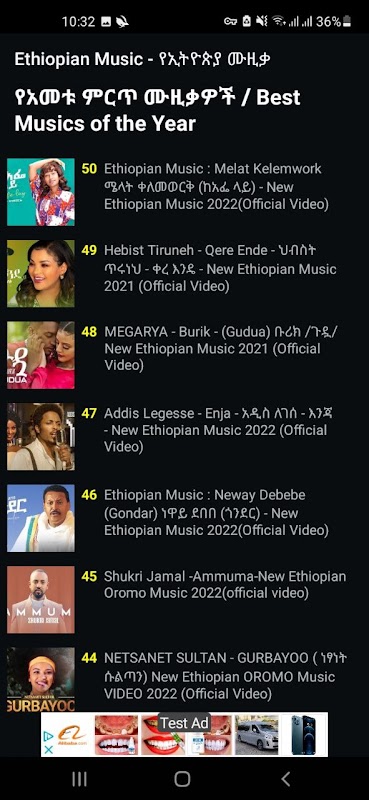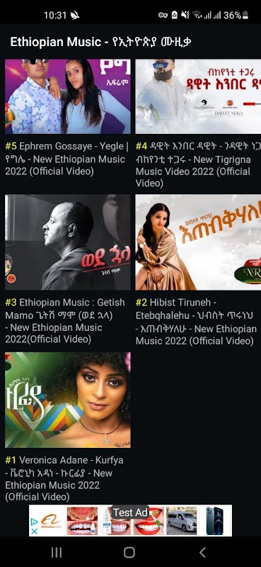 يتضمن تطبيق الموسيقى الإثيوبي هذا إصدارًا حديثًا وأعلى مقاطع الفيديو الموسيقية الإثيوبية تقييمًا.