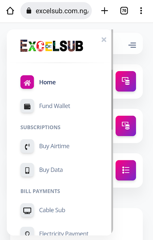 تعد Excelsub واحدة من أفضل منصات البيانات ووقت البث والفواتير. نحن نقدم إعادة الشحن الفوري لـ Airtime ، وحزمة البيانات ، و CableTV (DStv ، و GOtv ، و Startimes) ، ودفع فاتورة الكهرباء ، وطباعة بطاقة إعادة الشحن والمزيد.