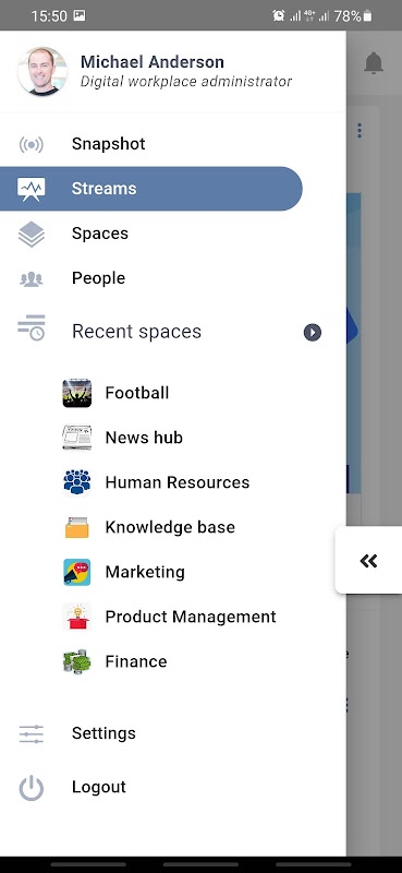 يعتمد تطبيق الهاتف المحمول الخاص بـ eXo Platform على تصميم بسيط وبديهي ، ويسمح التطبيق لفرقك بالوصول إلى مكان العمل الرقمي الخاص بهم ، ويتم إخطارهم بالأشياء المهمة والوصول إلى جميع ميزات النظام الأساسي أينما كانوا.