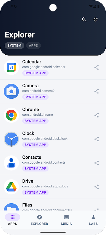 التطبيق إكسبلورر تظهر لكم مجموعة باسم جميع التطبيقات المثبتة في جهازك. كما تبين جميع التفاصيل من التطبيقات مثل إذن، خدمات، SDK الهدف والنشاط.