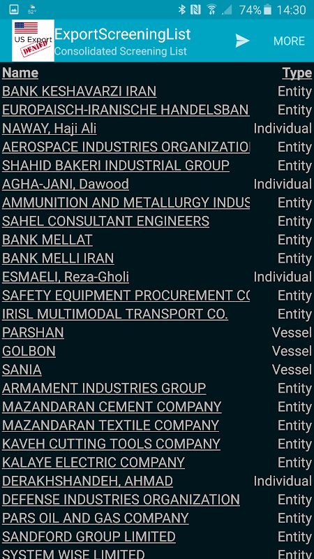This app may be used as an aid to industry in conducting electronic screens of potential parties to regulated transactions. In the event that a company, entity or person on the list appears to match a party potentially involved in your export transaction, additional due diligence should be conducted before proceeding. There may be a strict export prohibition, requirement for seeking a license application, evaluation of the end-use or user to ensure it does not result in an activity prohibited by any U.S. export regulations, or other restriction.
