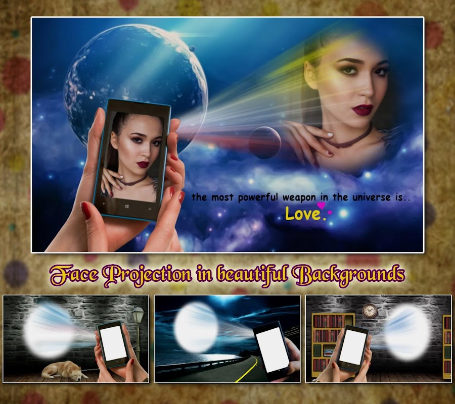 Face Projector is allow you to create beautiful projection Faces with different category Frames.It will create wonderful photo projection image with high definition. Face projector has a lot of collection of frames to add more attractive look to your image.