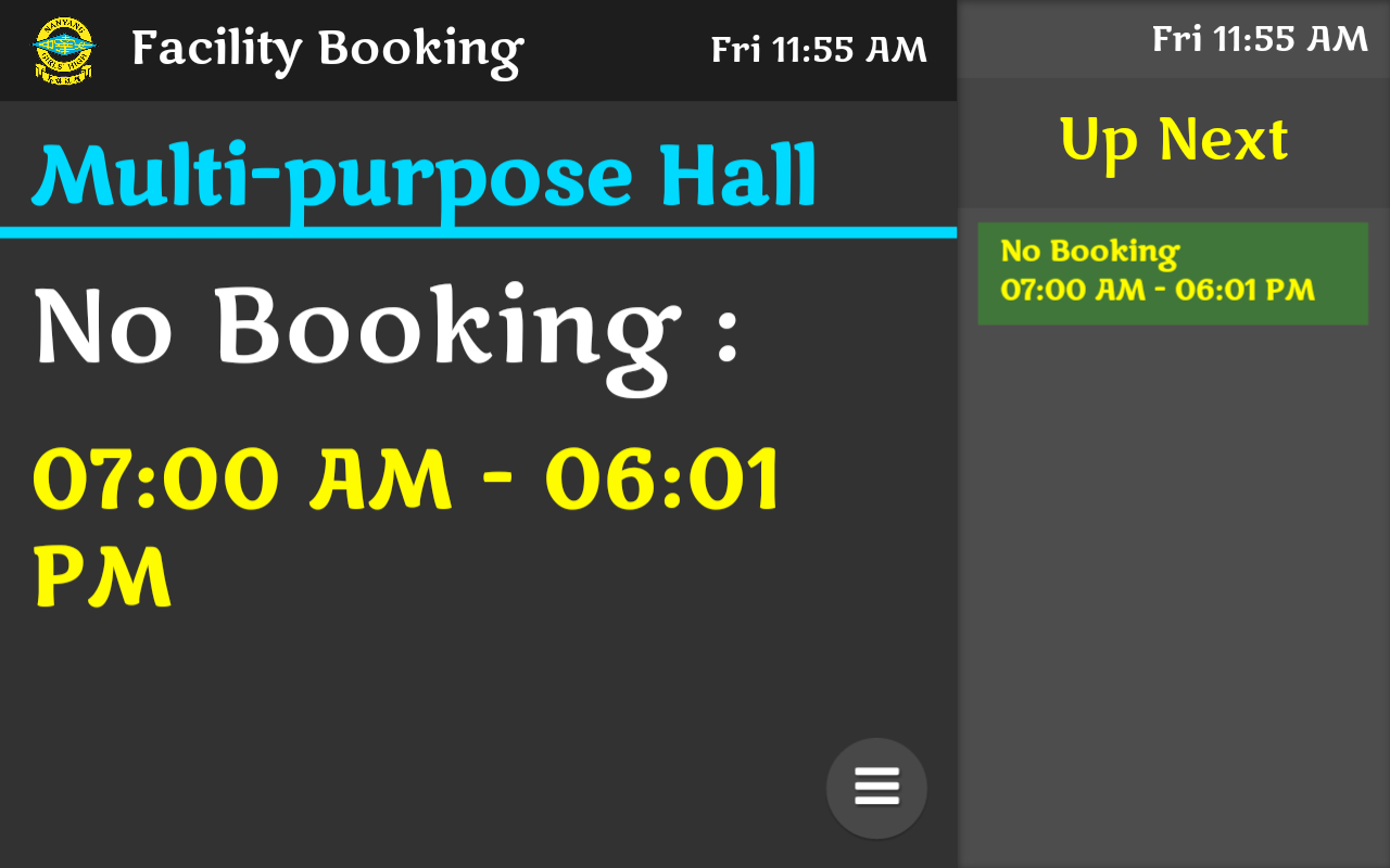 A Complete Facility Booking System for any organization. Manage Facilities, Facility Bookings, Time Slots, User Role, and More... App open like a Kiosk Mode/Signage Display it will show the Current and Upcoming Facility Booking details. App UI & Functionality controlled by Admin Screen
