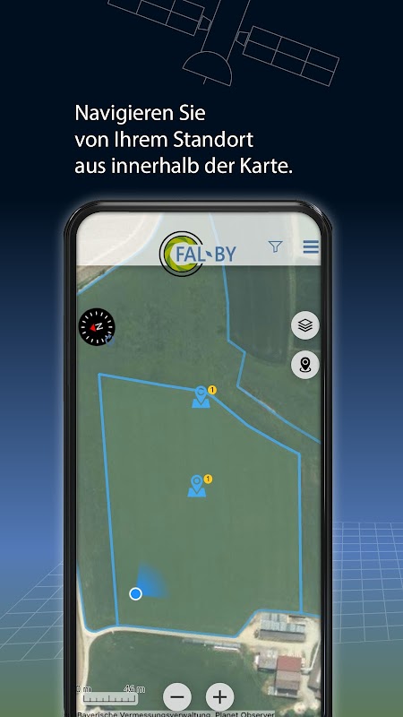 إذا لم يتم تحقيق نتيجة واضحة من خلال مراقبة الأقمار الصناعية ، فستتلقى مهمة في FAL-BY كمستخدم مسجل. عرض الخريطة يسهل التوجيه. يمكنك بعد ذلك التقاط صورة واحدة أو أكثر للمنطقة المحددة. ستساعد هذه الصور الموظف المسؤول في AELF على تقييم الموقف. في معظم الحالات ، يمكن توضيح التناقضات بسرعة بناءً على الصور المقدمة. عندئذٍ ، لم يعد الفحص في الموقع ضروريًا في كثير من الحالات ويوفر الوقت.