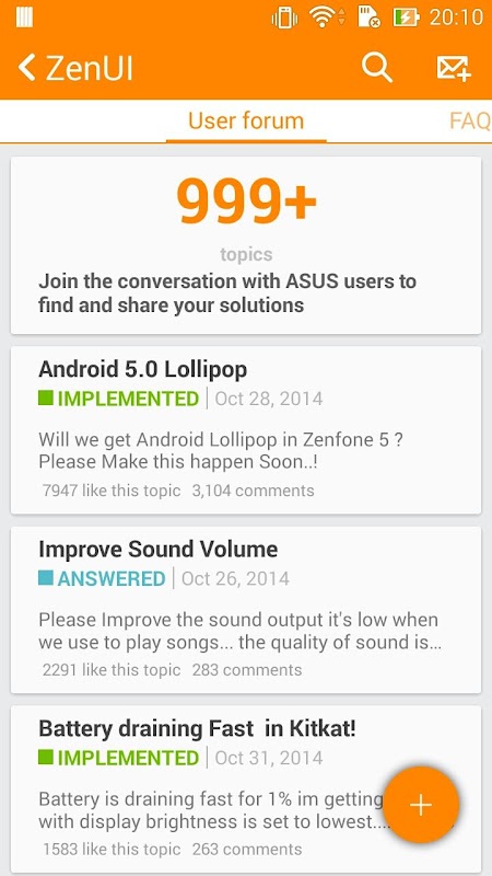 ► ZenUI الأسئلة الشائعة توفير تجربة المستخدم أكثر تحديدا عن طريق أسئلة متكررة والمنتديات التي تم إنشاؤها في التطبيق تحت التطبيقات ZenUI. في هذه المنتديات، يمكنك التصويت لموضوعات المفضلة لديك للسماح للفريق دعم ASUS يعرفون تلك التي كنت تريد أن ترى في التحديث القادم. أيضا ميزة ZenUI الأسئلة الشائعة أعلى أسئلة وأجوبة للحصول على معلومات استكشاف الأخطاء وإصلاحها الشعبية.