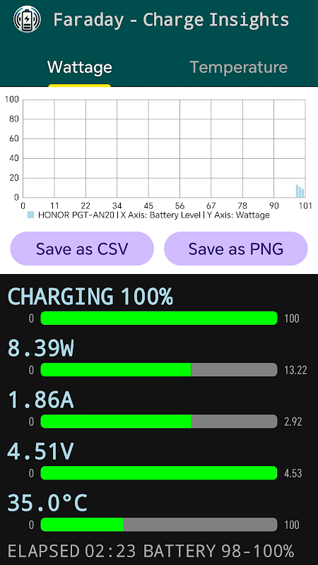 تطبيق جوال مصمم لقياس مقاييس الشحن في الوقت الفعلي مثل القوة الكهربائية والجهد والتيار ودرجة الحرارة. بالإضافة إلى ذلك، يمكنه إنشاء مخططات تاريخية تعرض اتجاهات القوة الكهربائية ودرجة الحرارة بمرور الوقت. يسجل التطبيق قوة الشحن ودرجة الحرارة على مستويات مختلفة للبطارية، ويجمع هذه البيانات في مخططات شريطية لسهولة التصور.