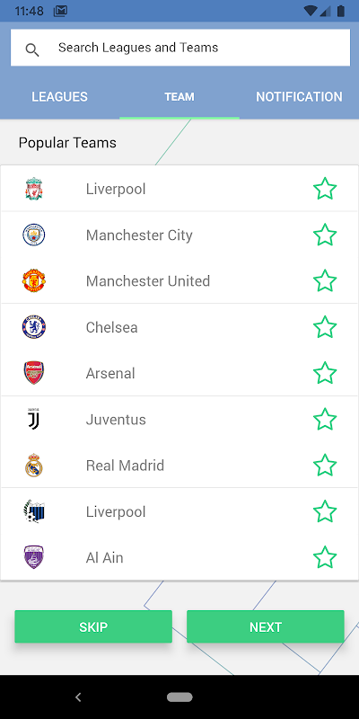 - اتبع فرقك / بطولات الدوري المفضلة لديك للحصول على التحديثات والإشعارات في المباريات الحالية