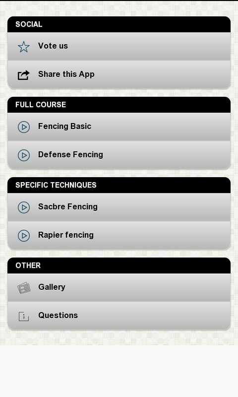 هذا التطبيق هو جزء من فنون الدفاع عن النفس اختيار التطبيق حيث يمكنك أيضا العثور على محتويات لمعرفة جيتسو البرازيلية الأمريكية كينبو, هاب كيدو ، أيكيدو والكثير أكثر! أنت الآن خطوة أقرب إلى أن تصبح المبارزة مقاتلة من أحلامك. تعلم المبارزة باستخدام هذا التطبيق مجانا الآن!
