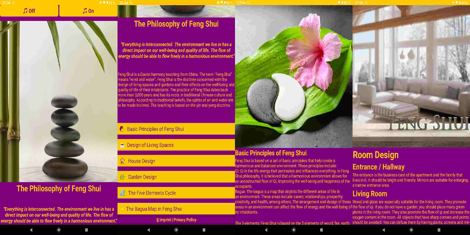 يحتوي تطبيق Feng Shui على المحتويات والميزات التالية: