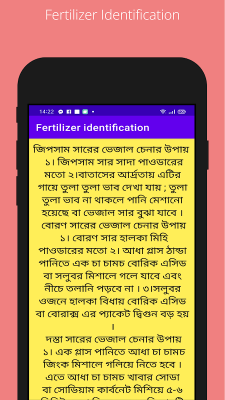 Fertilizer Identification is a tools app for identification of some chemical fertilizers. With the App anybody can detect original form of Urea, TSP, DAP, MOP, Gypsum, Boron, Zinc fertilizers. Simple test are discussed in the App. Very low cost available method are used to find out original fertilizers. There are only 3 screen in app. 7 buttons are used in app .First 4 button click for screen2 and next 3 button for screen 3 .language used in app Bangla. Farmers can easily use it in Bangladesh and India. The APP can be helpful for fertilizer users .