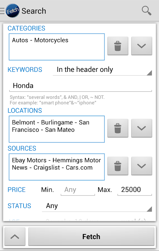 Fetch allows to search for postings on Apartment.com, Backpage, Cars.com, Craigslist, Ebay Motors, Hemmings Motor News, Indeed, and Rent.com.