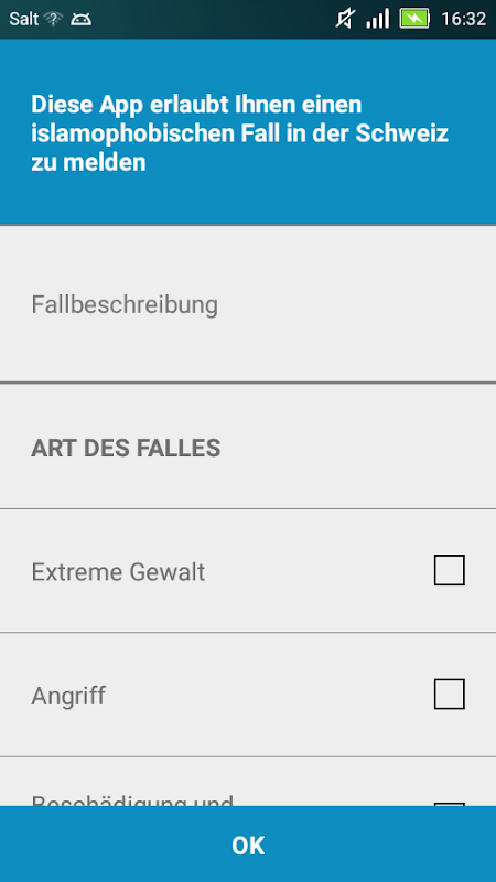 مع هذا التطبيق يمكنك العودة الخبرات كراهية الإسلام والحوادث. وقد تم تطوير هذا التطبيق نيابة عن اتحاد المنظمات الإسلامية مظلة سويسرا (FIDS). تتم معالجتها رسالة عن طريق ميناء دعوتنا لل.