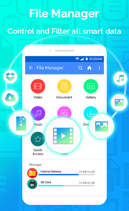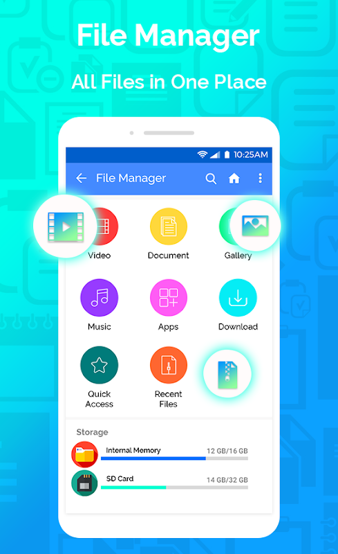 The optimized search engine of file explorer will find file in internal storage and SD card in 1 second. And users can browse files by category, e.g. image, music, video, apps, etc.