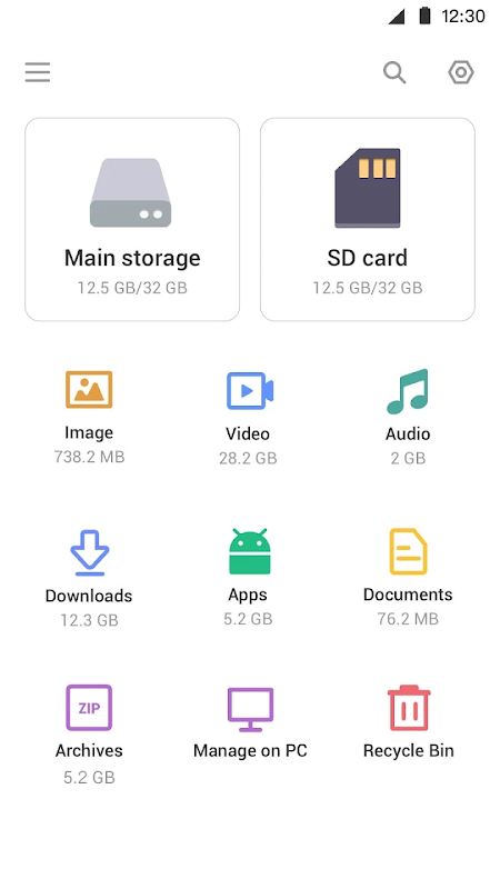 • التخزين الرئيسي / بطاقة SD / USB OTG: يمكنك إدارة جميع الملفات والمجلدات على كل من وحدة التخزين الداخلية ووحدة التخزين الخارجية.