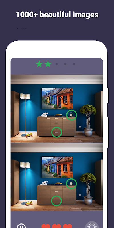 مارس عقلك وألعب حدد الاختلاف وابحث عن اختلافات في 500 صورة مقسمة إلى فئات مثل الغرف والمدن والخیال وما إلى ذلك. هناك الكثیر