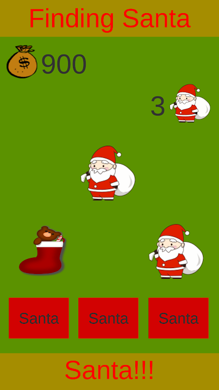 لكل جولة لعب اختر أحد الأزرار الثلاثة للعثور على سانتا. معرفة ما إذا كان يمكنك العثور على معظم سانتا !!!