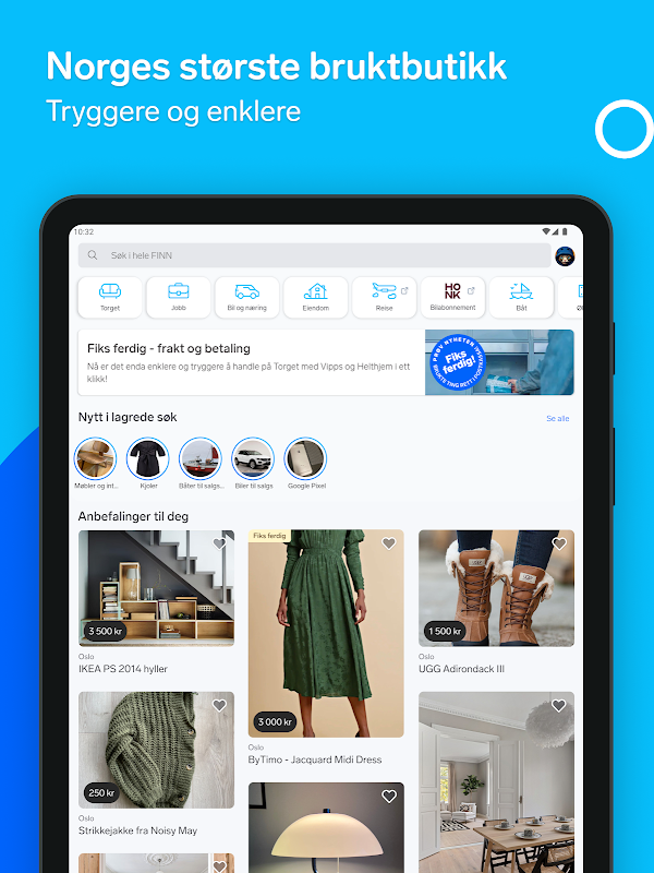 تذكر أيضًا أنه يمكنك نشر إعلان ملابس على Torget مجانًا تمامًا ، وبإتمام Fiks ، يمكن أن تتم التجارة بأكملها بدون رسائل. سيكون هناك قريبًا مليون إعلان جاهز للإصلاح على FINN torget ، لذلك إذا كنت متحمسًا أكثر لمجرد البحث والشراء ، فسيكون لديك الكثير لتشترك فيه.