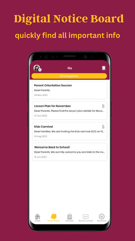 تحديثات فورية: يمكن للوالدين تلقي جميع التحديثات المتعلقة بطفلهم بدءًا من الحضور والواجبات المنزلية وخطط الدروس والجداول الزمنية وما إلى ذلك من المدرسة على الفور من خلال الإشعار.