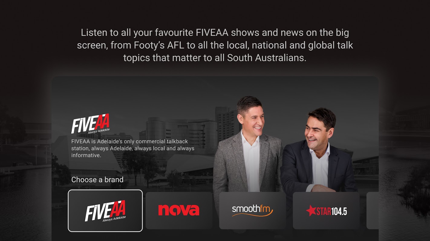 يتيح لك تطبيق FIVEAA TV Player الجديد الاستماع إلى جميع برامج وأخبار FIVEAA المفضلة لديك على الشاشة الكبيرة. إن لعبة Footy's AFL مدرجة دائمًا على جدول الأعمال وكذلك جميع موضوعات الحديث المحلية والوطنية والعالمية التي تهم جميع سكان جنوب أستراليا. قم بتنزيل تطبيق FIVEAA TV Player واستمتع بأفضل ما في Always Adelaide على تلفزيونك