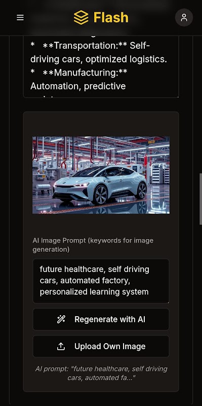 لا حاجة لخبرة في التصميم. يختار Flash التخطيطات تلقائيًا ويُنشئ صورًا ذات صلة باستخدام الذكاء الاصطناعي، لتبدو كل شريحة أنيقة واحترافية ومتوافقة مع علامتك التجارية.
