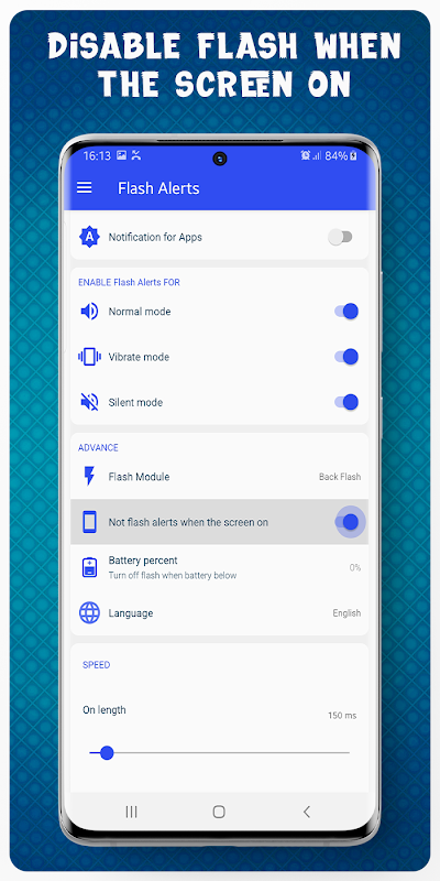 Blink Flash في إشعارات المكالمات ، سيسمح لك التطبيق بميض كاميرا مصباح الهاتف المحمول عندما تتلقى إشعارات مكالمة هاتفية أو رسالة نصية قصيرة SMS أو إشعارات أخرى. يمكن أن تزيد ميزة Flash on-call من راحة المستخدم أو تساعد المستخدم من ذوي الإعاقة.