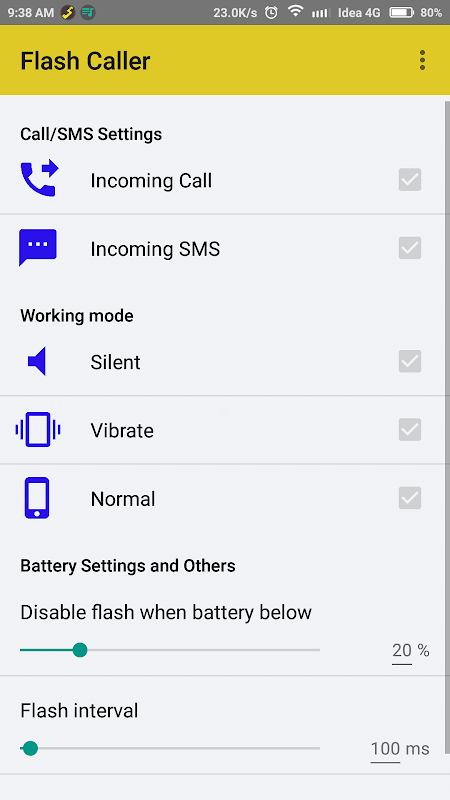 4) Set the flash on Call and SMS working in any mode ( Normal, Vibrate or Silent )