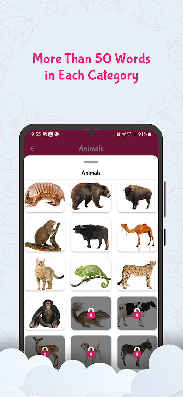يغطي التطبيق مجموعة متنوعة من الفئات مثل الحيوانات والفواكه والخضروات والأشكال والطيور وغيرها الكثير. يضمن هذا التنوع تعرض الأطفال باستمرار لكلمات وأفكار جديدة.