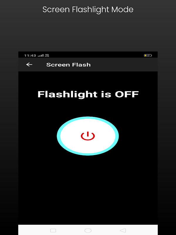 باستخدام تطبيق المصباح هذا ، يمكن للمستخدم التبديل إلى وضع مصباح LED أو وضع مصباح الشاشة. يحتوي على زر جذاب ومفيد للغاية لتشغيل وإيقاف تشغيل المصباح.